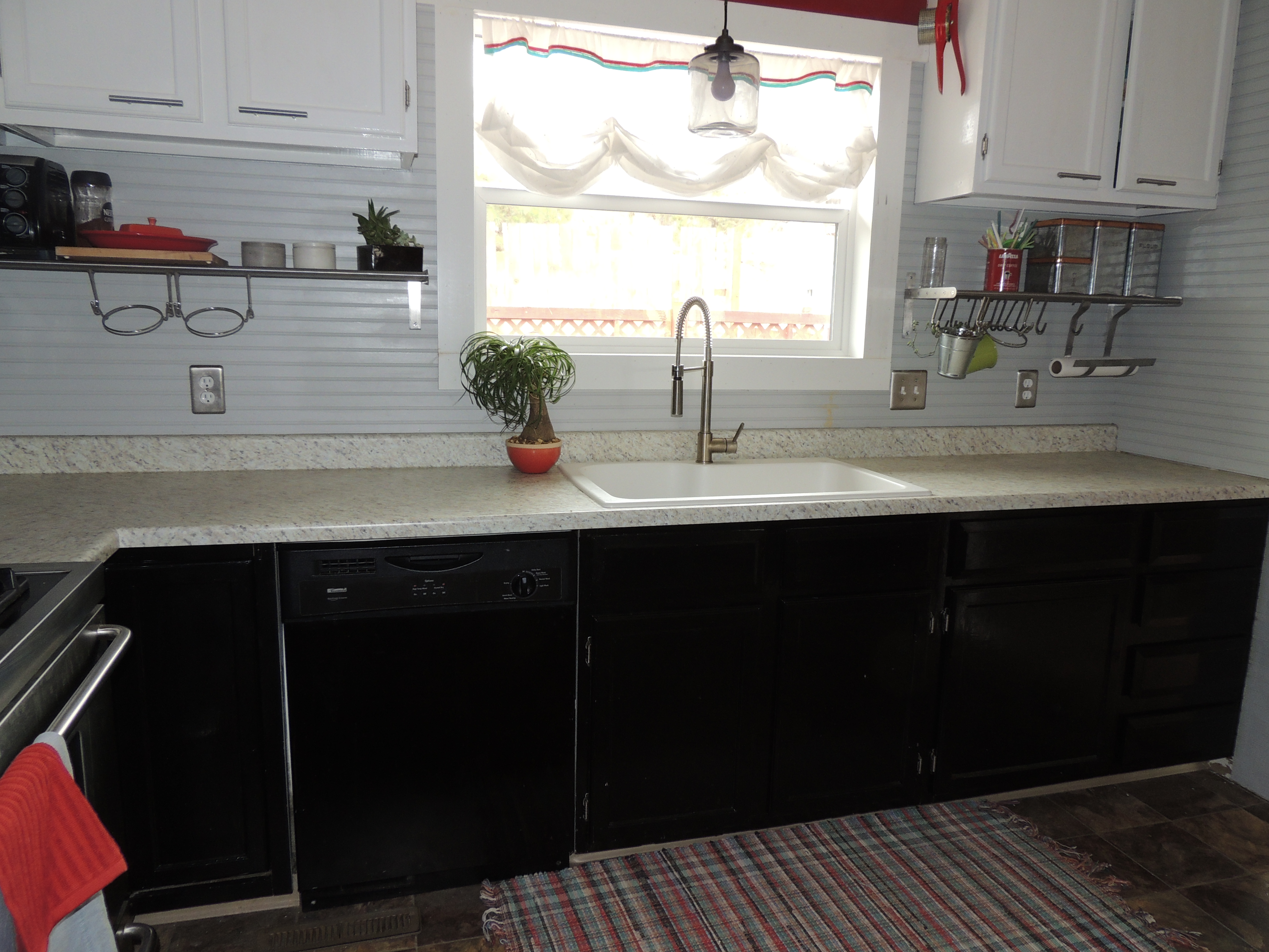 So….back in the kitchen…..there was a terrible blue laminiate overlay on the original orange counter top. So after much deliberation I decided to go with another laminate from Lowe’s. It went perfectly with the colors I painted the cabinets.