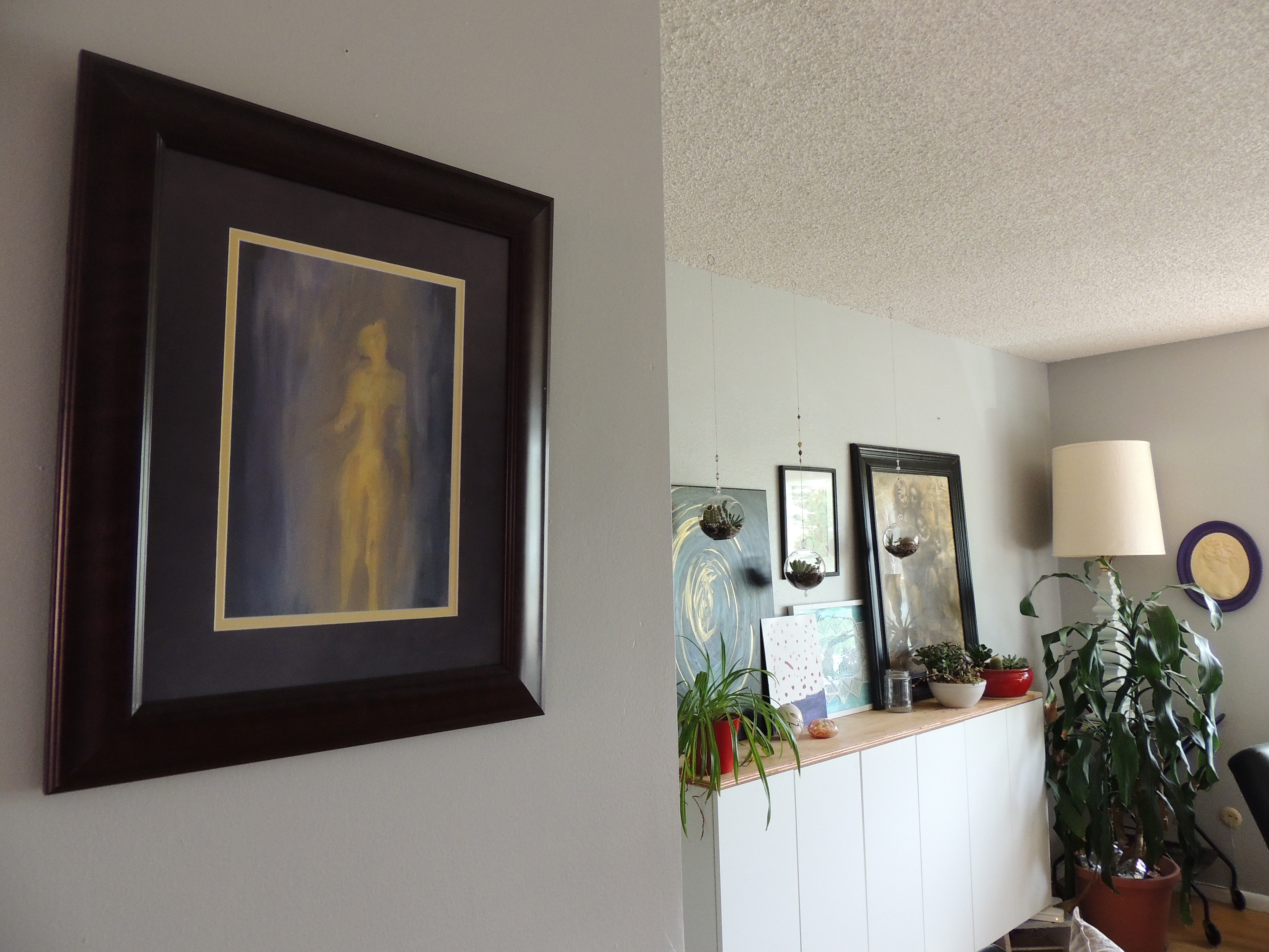 One of the things that I try to pay attention to, is the art that I make or bring into the house. In my early years of decorating my apartments and first house….I used a lot of commercial stuff. Some of it I still have, some of it I have kicked to the curb in an effort to expand past my ‘norms’. In my first apartment my bedroom was filled with all things angels, then I moved into pics of anything tropical, then it was all random stuff. I have culled the stockpile and pulled out all of my favorites and those are what what made it on my walls in this house. I have added my own pieces as time has gone by. I have this complusion to paint, sometimes painting is all I want to do….other times looking at my own stuff iritates the everliving crap out of me. Here before you….I have a few examples of my own work as well as some work that has struck a cord with me and I have brought home with me…..
