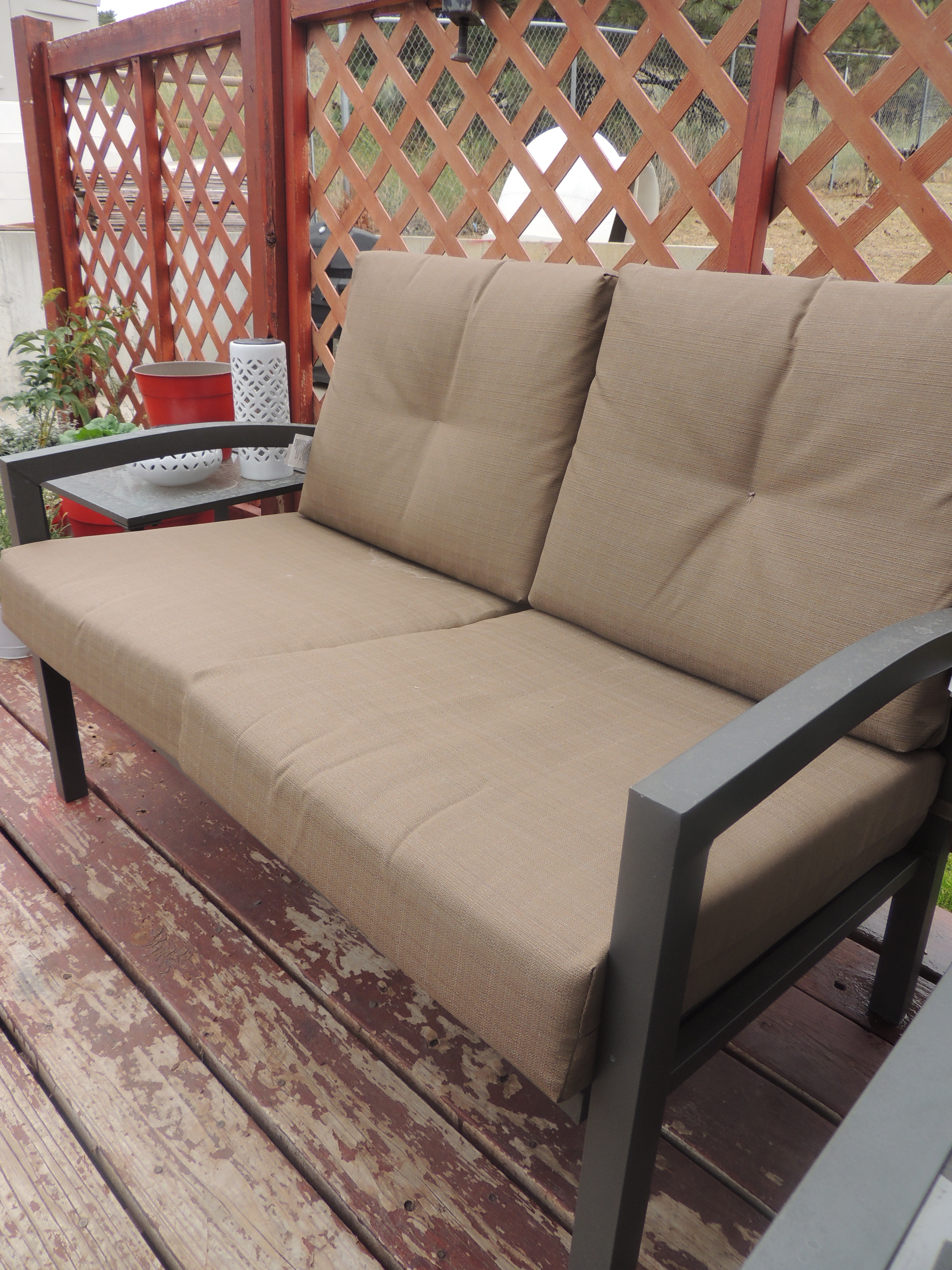 Just to remind you…..my ghetto backyard.….is in need of love. Since the summer is slipping away from me and the deck seems to be hanging around for longer than I would like….I went on an impromptu shopping trip to Target the other day and came across the most awesome sale. All summer stuff 50% off!!! Holy Crapola! I took a gander at the patio furniture and found the following items that now live with me.