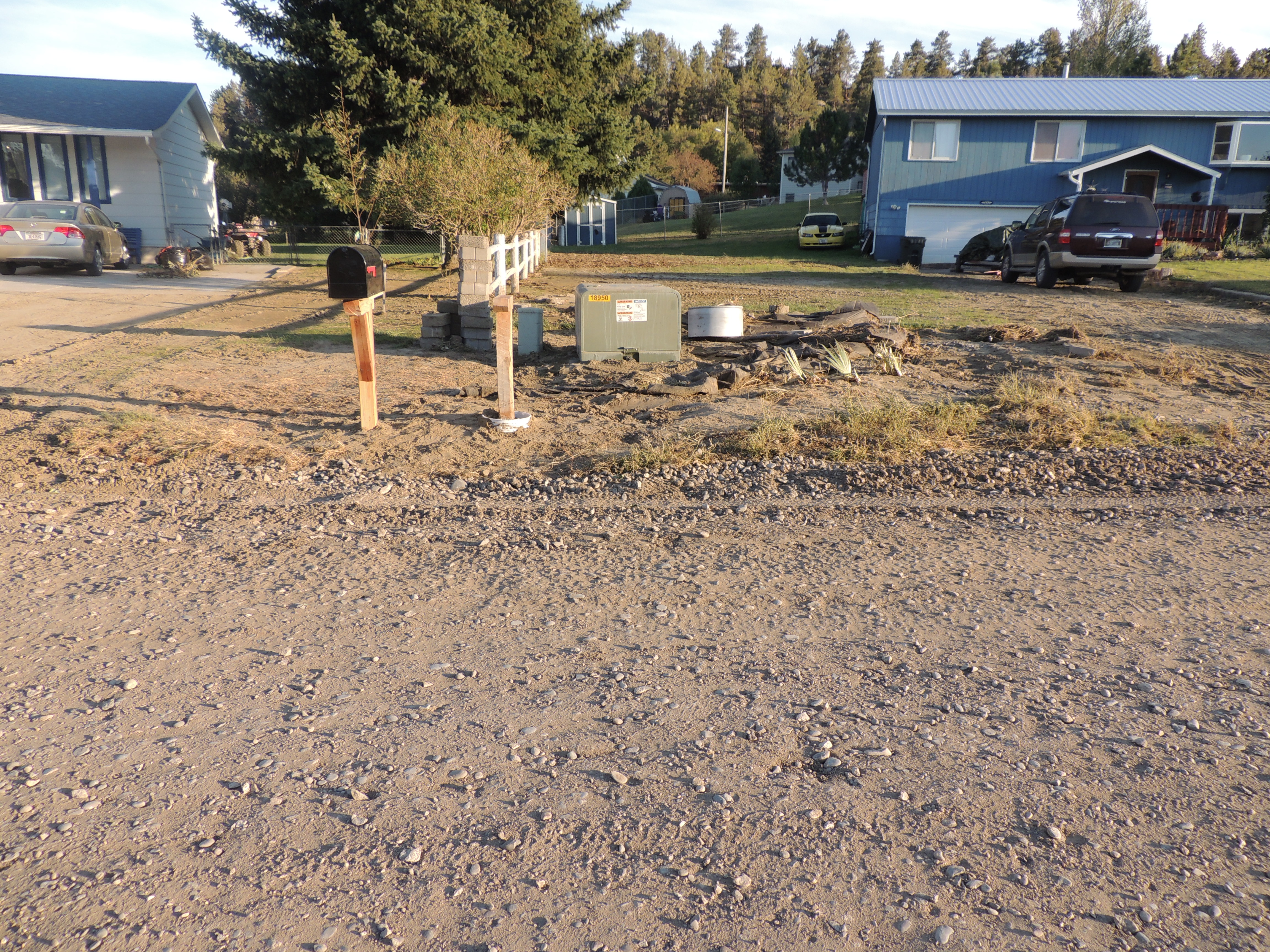 Remember Mailbox Garden??.…well this is what it looks like now…… After my super sweet neighbor started working on getting us both mailboxes back up, after gathering the blocks from where they landed in the borrow pit down the road…AND AFTER the county re-graded the road.