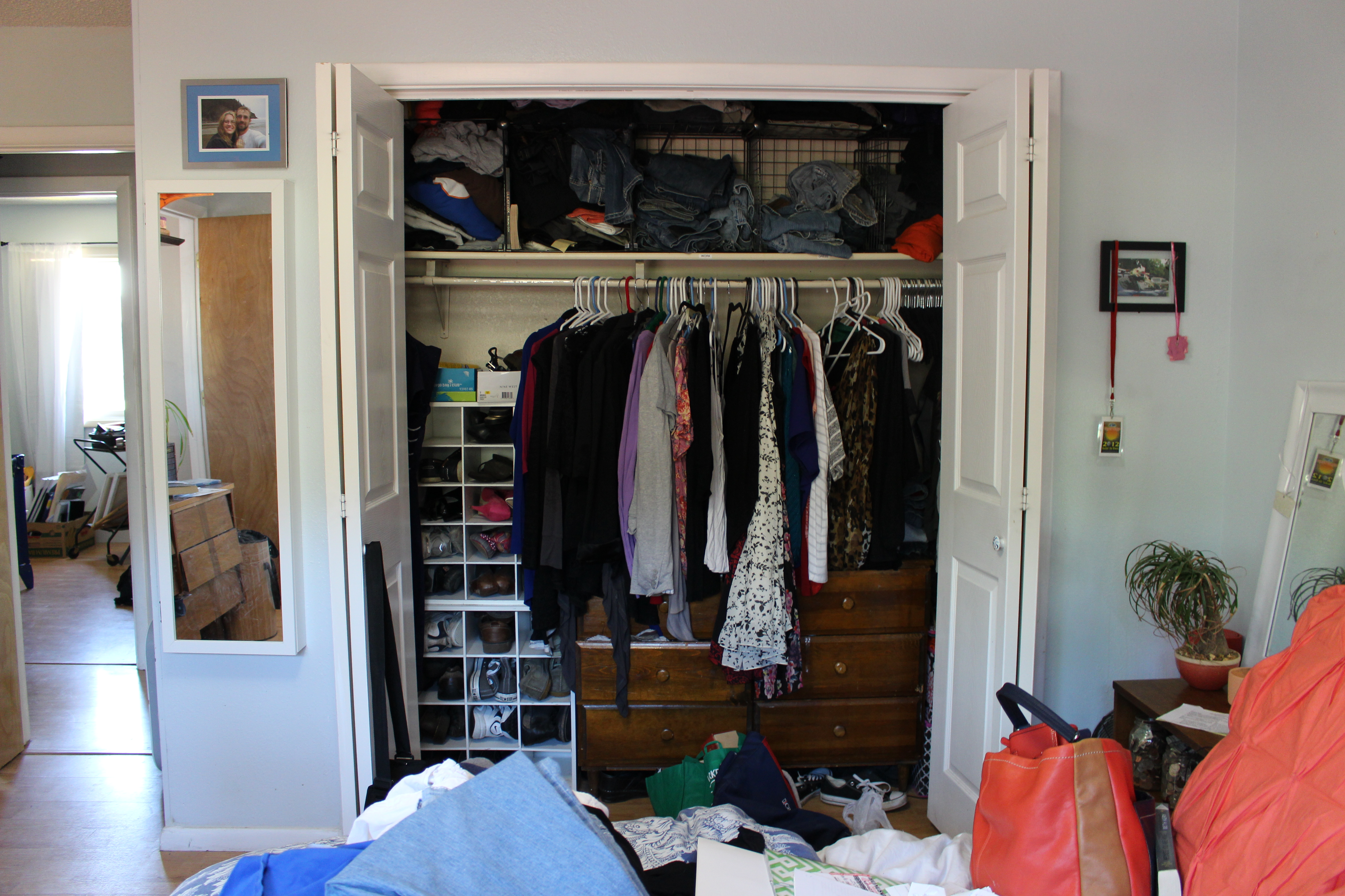 I left Dave’s clothes (on the right-starting after the dress and going all the way behind the wall) alone for the most part. If I haven’t worn an article of clothing in a year, it went into the hold box. I decided on a hold box to ensure that I don’t end up with purge regret. I will keep the box in storage for roughly 3 to 6 months and if I do not go digging in it – the box will go to a clothes swap or be a donation.