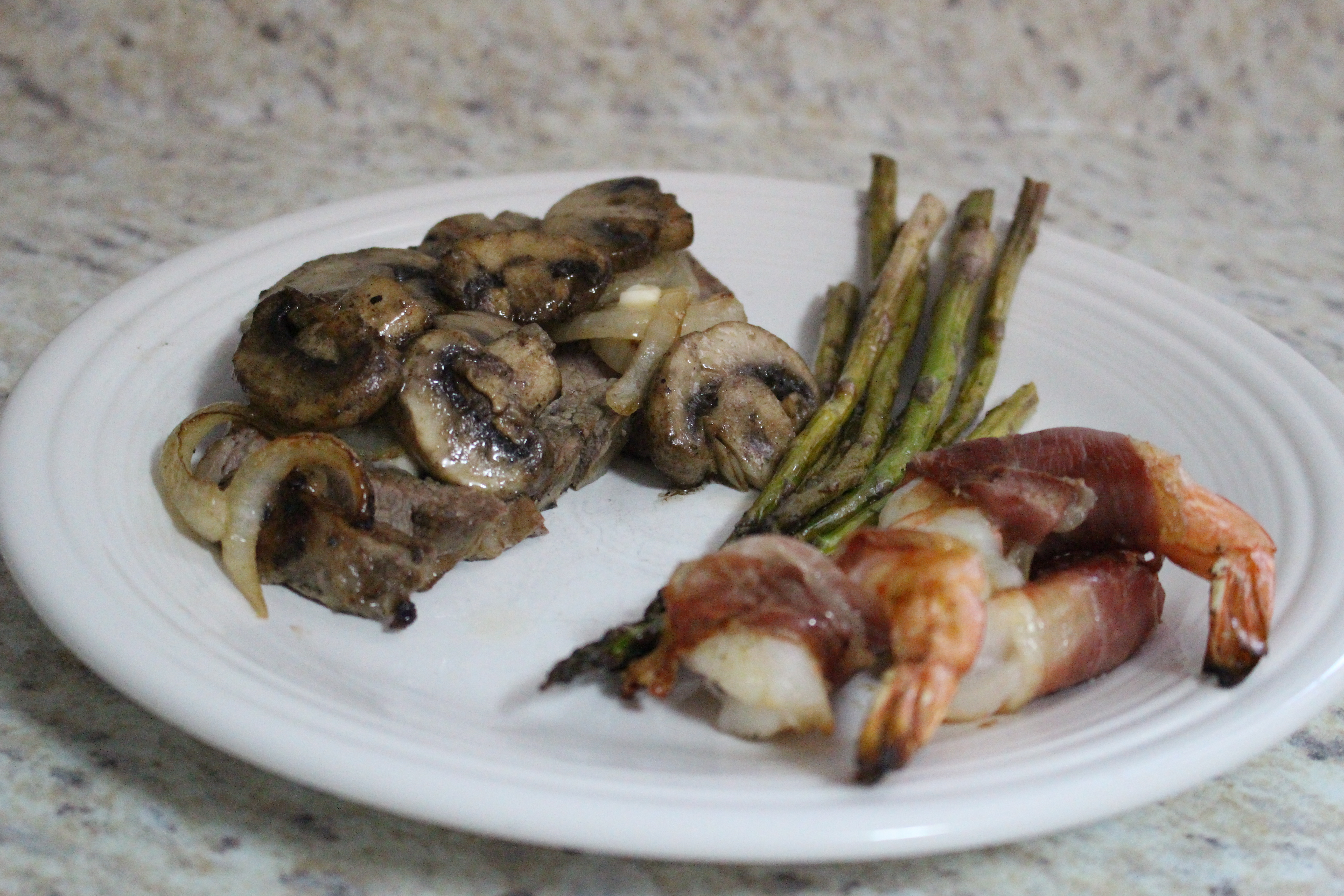 Timing is everything. Steaks first, then asparagus, then get your saute on, lastly the shrimp……pull off the grill or get off the stove and place on your plate and fill your face. You will be glad you did.