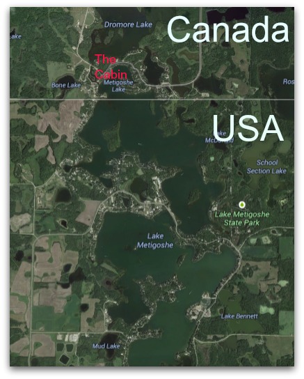 We crossed the border at Carbury, ND and traveled through the land of Manitoba to the north side of Lake Metigoshe. The cabin is situated right where the C is.