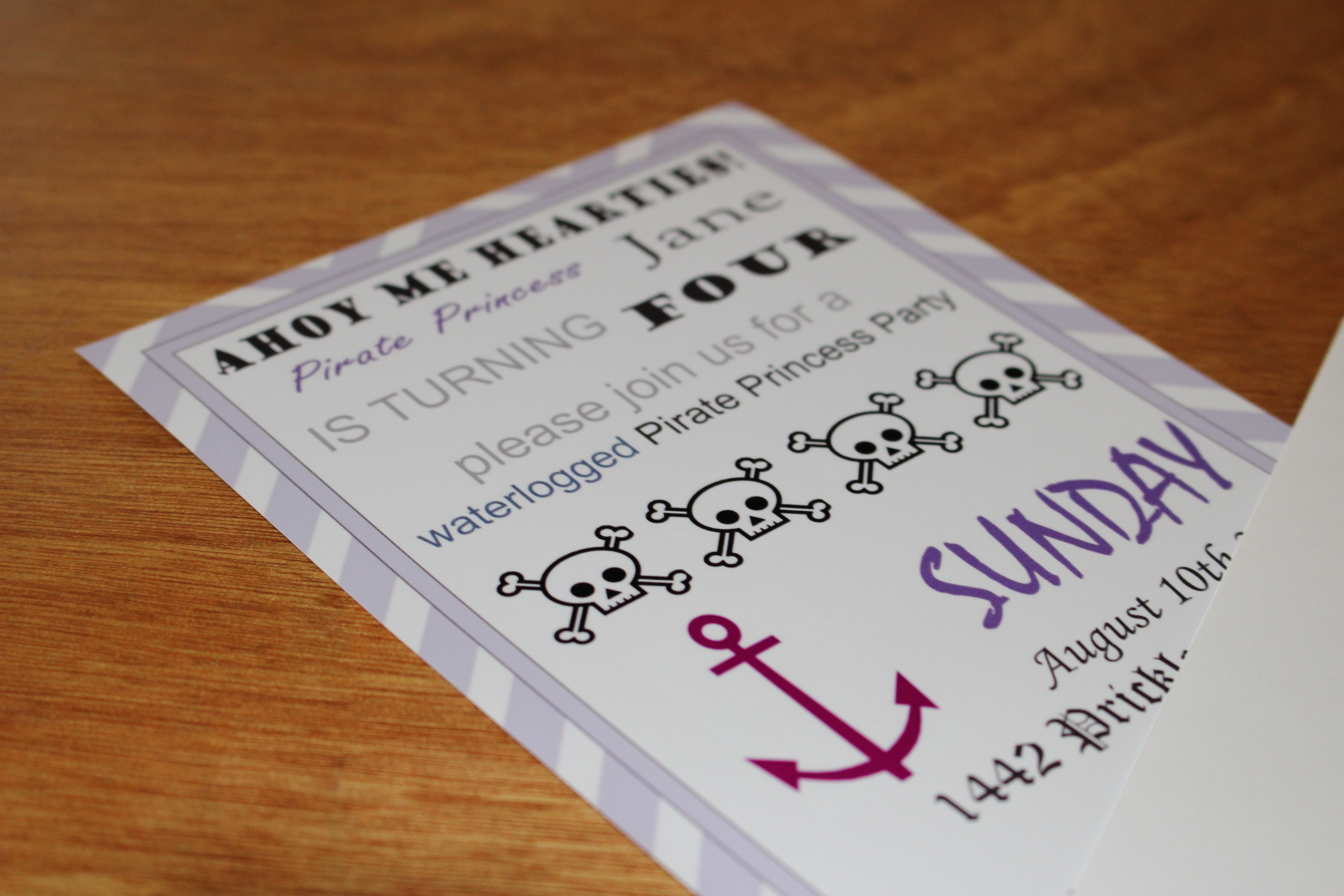 I started with the invites as those would be my jumping off point for ideas. I used a graphic design program and came up with invite below. A quick upload to Walmart Photo Shop online and I had invites in no time.