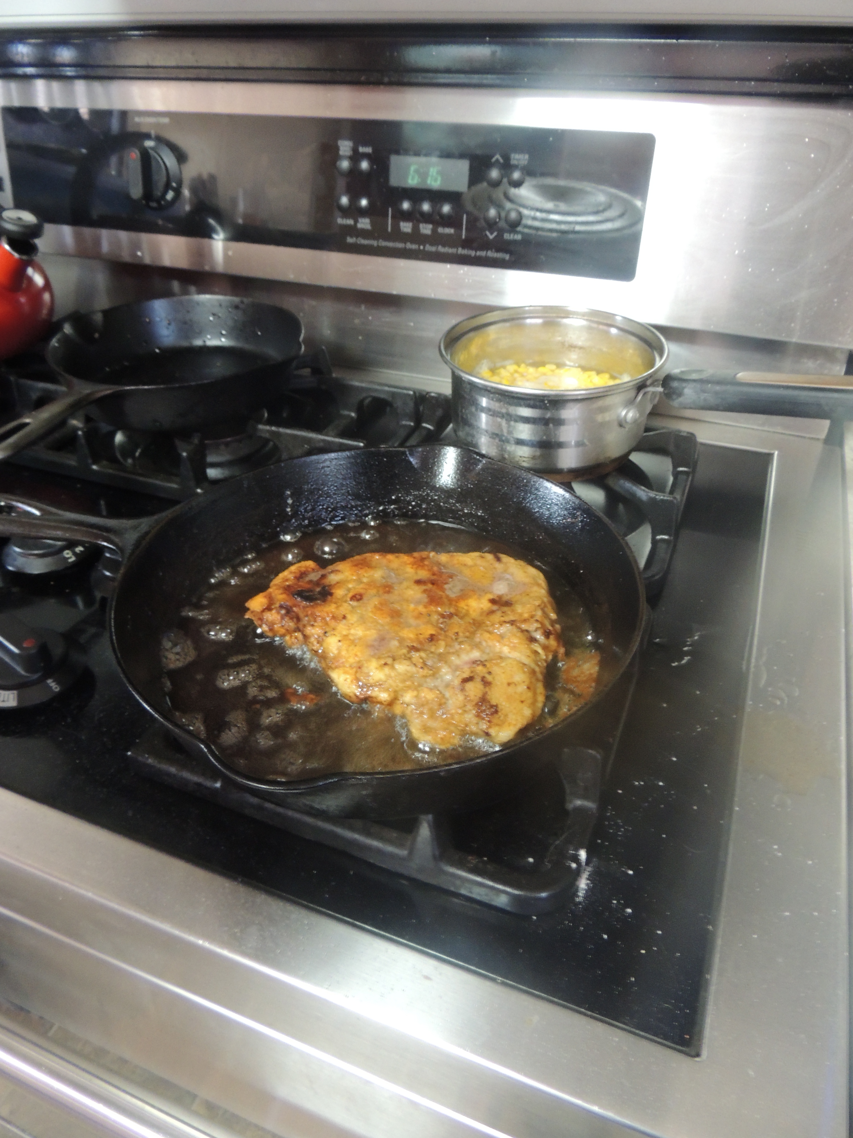 I dredged the steak in the egg, then the flour bowl, then the egg and then the four again. I dropped the steaks into our cast iron skillet, preheated with 1/2 cup canola oil.